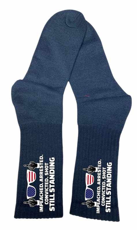 Add to WishlistMake a defiant political statement with our "Impeached, Arrested, Convicted, Shot Still Standing" Socks. This statement apparel features the bold slogan, which refers to the political and legal challenges faced by President Donald Trump, including the assassination attempt. Made from a soft, durable fabric blend in a versatile black color, they are perfect for everyday wear and designed to spark conversation.