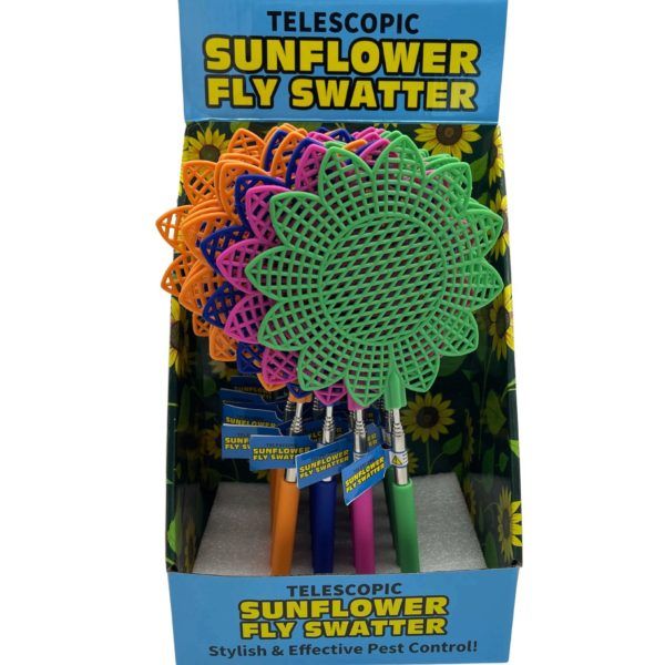 Add to WishlistKeep pests at bay in style with this Telescopic Sunflower Fly Swatter, conveniently displayed in a 24-piece countertop display. Each swatter features a playful sunflower-shaped head and comes in assorted colors, making them both functional and eye-catching. The swatter measures 5" x 11" and extends up to 28.5", perfect for reaching flies on walls, ceilings, or windows. A must-have for the home, especially during warmer months when flies are more active, this swatter combines fun design with practical use. Ideal for kitchens, patios, and any indoor or outdoor spaces where flying pests are a nuisance. ,Telescopic Sunflower Fly Swatter in Countertop Display,