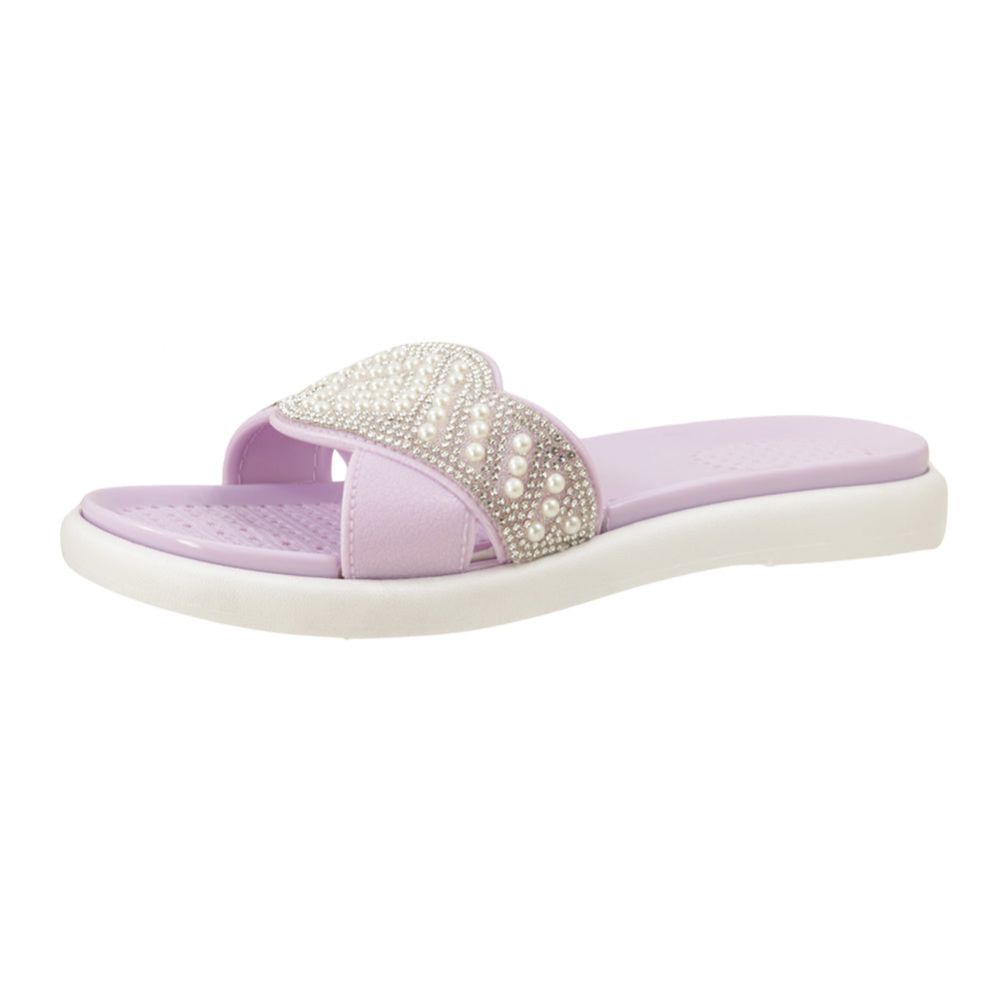 Add to WishlistThese women?s slide sandals in lilac feature sparkling rhinestone and pearl accents for a soft yet glamorous style. The slip-on design offers convenience and comfort with a cushioned sole ideal for day-to-evening wear. The delicate lilac shade adds a fresh and feminine touch to any outfit.